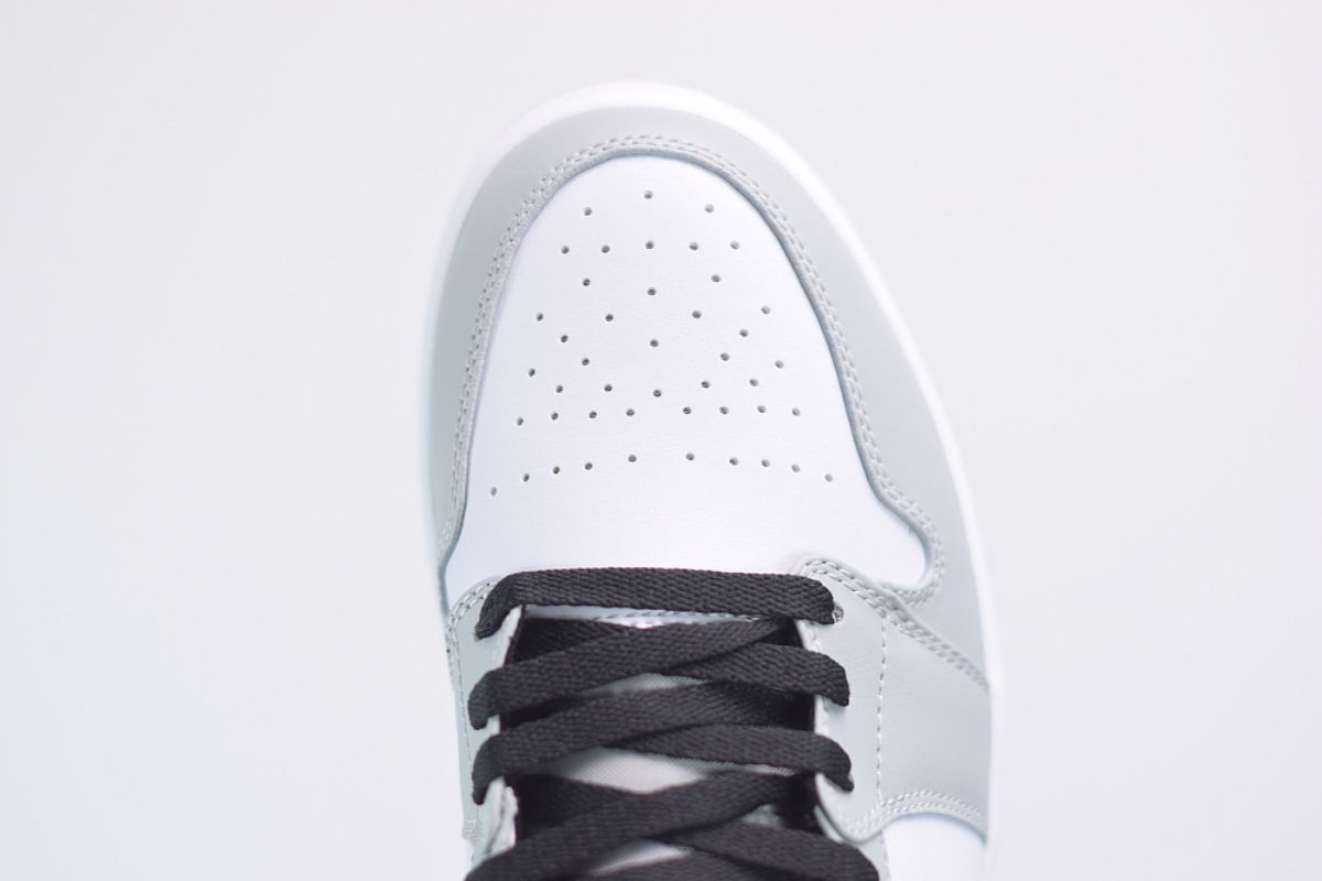 Das Obermaterial dieser Version besteht aus weichem, elegantem weißem Leder, das eine leuchtende Basis bildet. Hellgraue Nubuk-Einsätze bereichern das Design, insbesondere am Swoosh und im Bereich um den Knöchelkragen, und sorgen für eine subtile Textur, die einen Kontrast zur Helligkeit des weißen Leders bildet. Die Kombination aus Hellgrau und Weiß verleiht dem Schuh einen raffinierten und modernen Look, der dennoch der DNA des Jordan 1 treu bleibt.