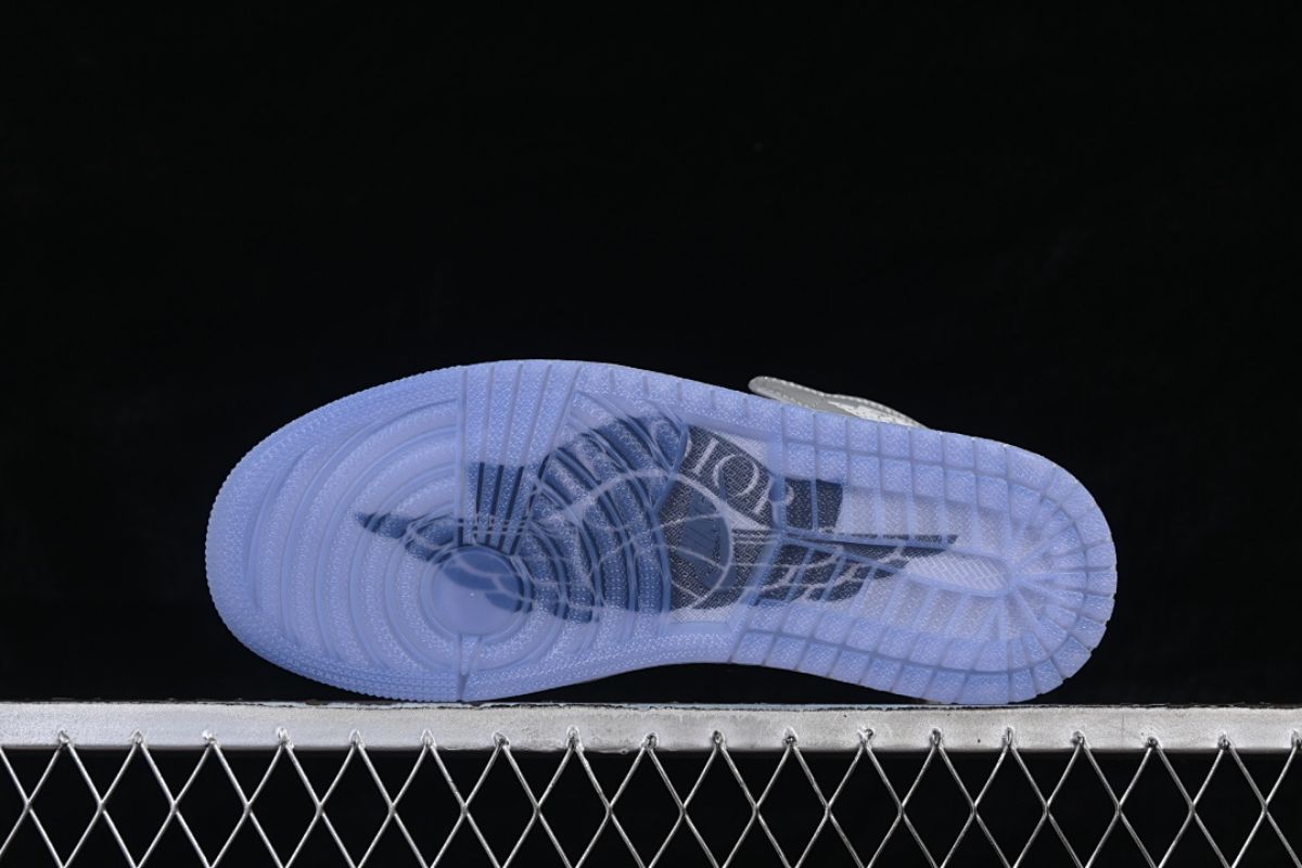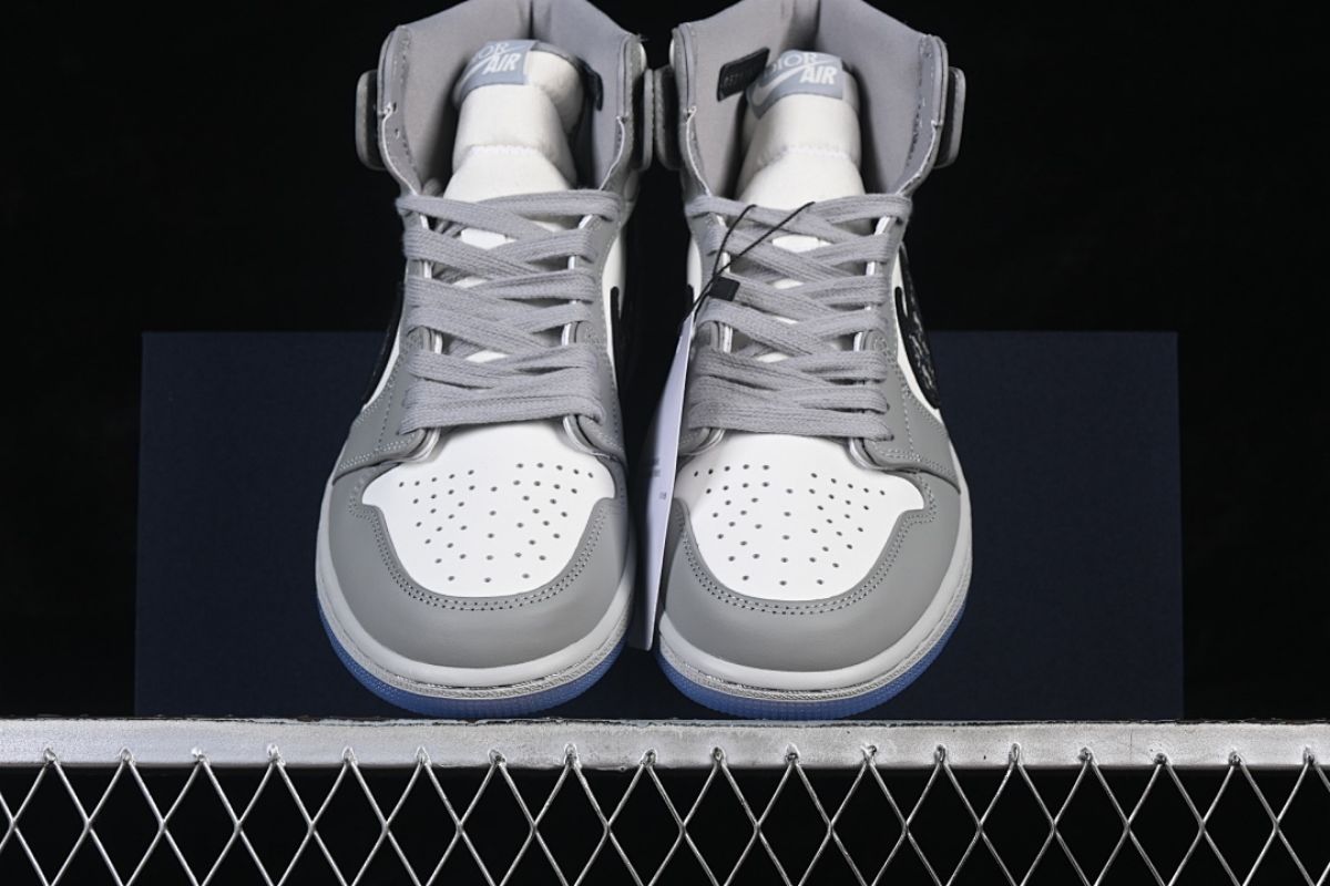 Dieser Air Jordan 1 High besteht aus einem weiß-grauen Obermaterial aus Leder mit dem traditionellen Dior-Monogramm-Print Swoosh. Diese Schuhe werden in Italien aus hochwertigen Materialien hergestellt. Co-branded eisige, durchsichtige Sohlen, eine Zunge mit Dior-Logo und Wings-Logo sowie ein silbernes „Air Dior”-Etikett runden das Design ab.