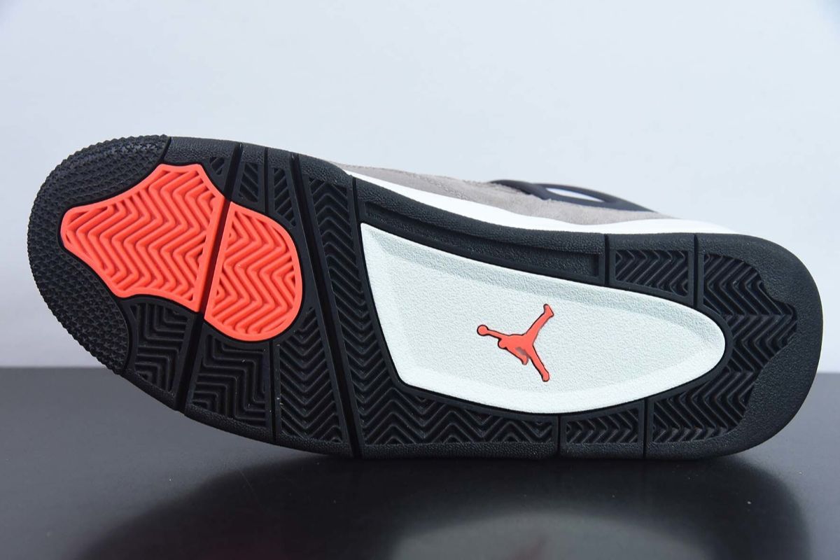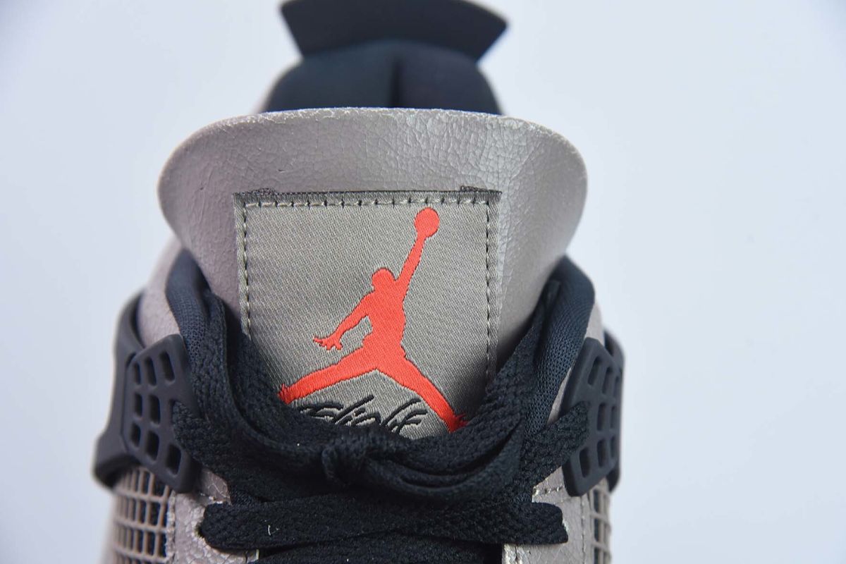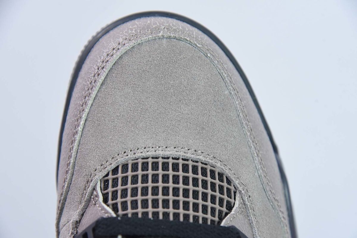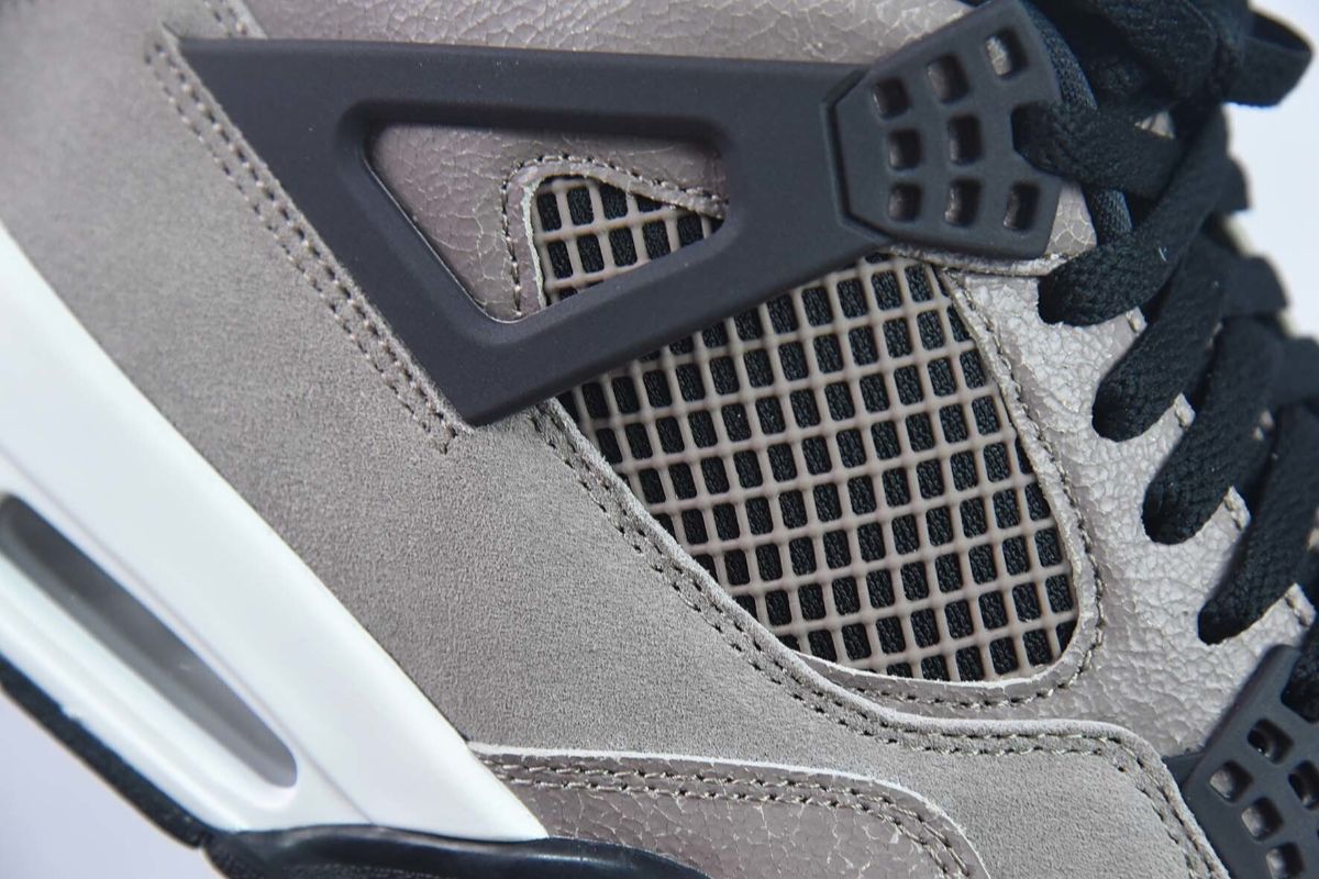 Das Obermaterial dieses Air Jordan 4 besteht aus hochwertigem taupefarbenem Wildleder, das sich weich anfühlt und dessen neutrale Farbe perfekt zu den anderen Elementen des Schuhs passt. Das hellbeige Mesh an den Seiten und der Zunge sorgt für optimale Atmungsaktivität und verleiht dem Design zusätzliche Struktur. Schwarze Akzente an den Ösen und der Zunge sorgen für einen subtilen, ausgewogenen Kontrast, während graue Details dem Modell Tiefe verleihen.