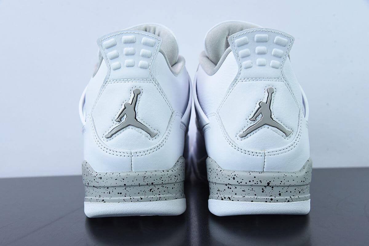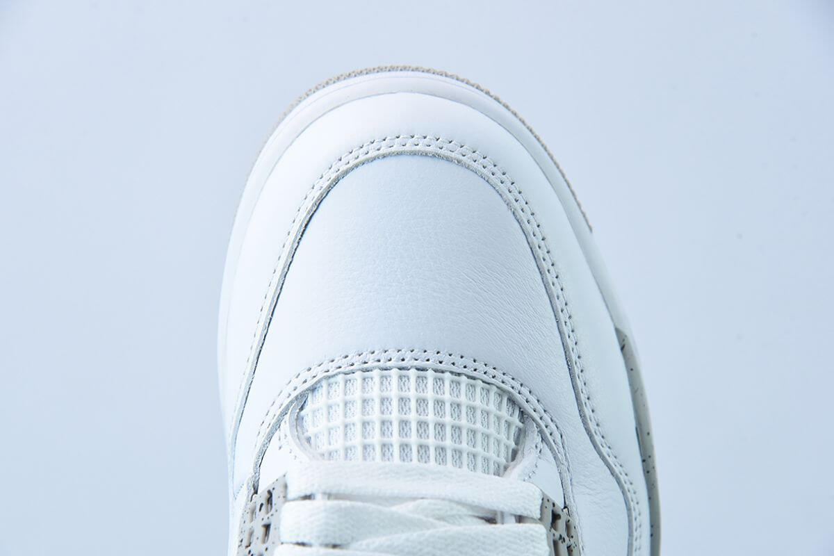 Das Obermaterial dieses Air Jordan 4 besteht aus hochwertigem weißem Leder, das für ein klares und glattes Finish sorgt, während hellgraues Wildleder an den Ösen und um die Ferse herum verwendet wird und für eine weiche Textur und einen visuellen Kontrast sorgt. Das weiße Mesh an den Seiten und der Zunge sorgt für optimale Atmungsaktivität und angenehme Leichtigkeit. Schwarze Akzente an den Ösen und Details an der Zunge runden die Farbpalette ab und verleihen dem Gesamtbild zusätzliche Tiefe.