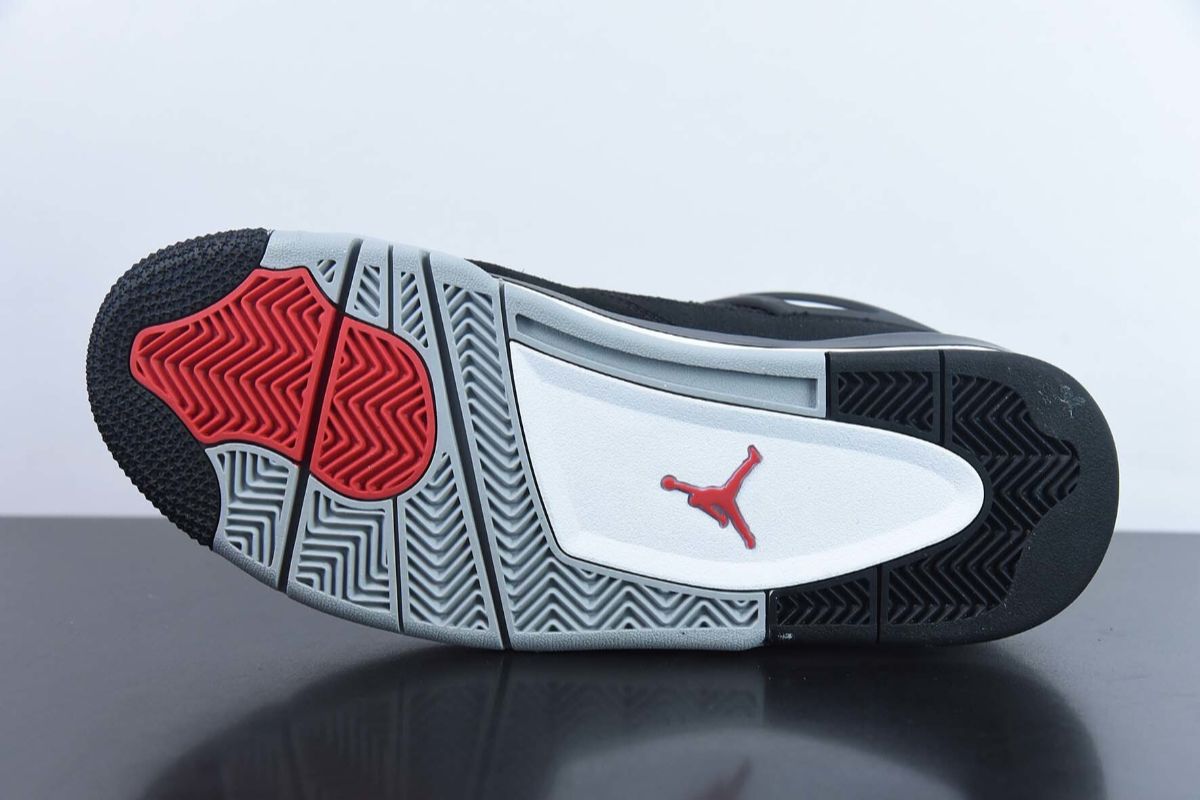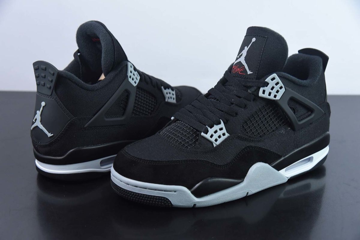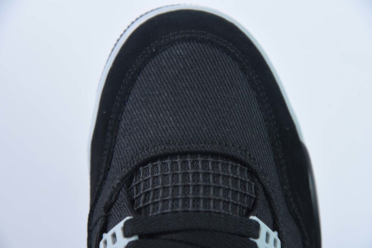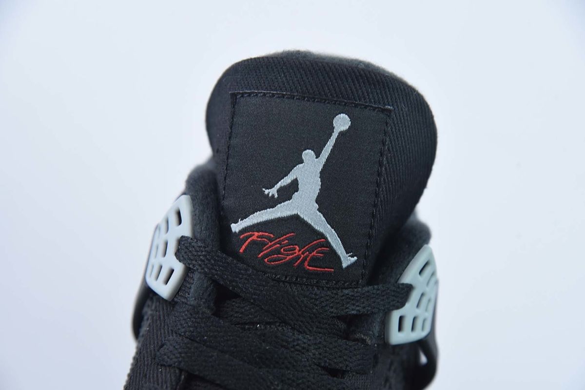 Das Obermaterial besteht aus schwarzem Canvas, das den gesamten Schuh von den Seiten bis zum Vorderfuß bedeckt und eine robustere Alternative zu traditionellem Leder darstellt. Überzüge aus schwarzem Wildleder verstärken den Spritzschutz und die Rückseite des Schuhs und verleihen ihm Struktur. Die für das AJ4-Design charakteristischen geformten Ösen und TPU-Elemente sind hellgrau gefärbt, ebenso wie die Stützelemente im Knöchelbereich. Die Zunge aus Canvas ist mit einem schwarzen Patch mit grauem Jumpman verziert, der die schlichte Ästhetik des Modells unterstreicht.