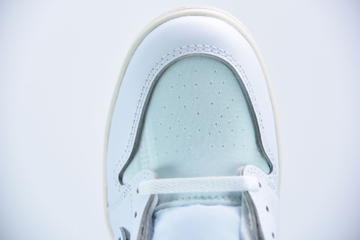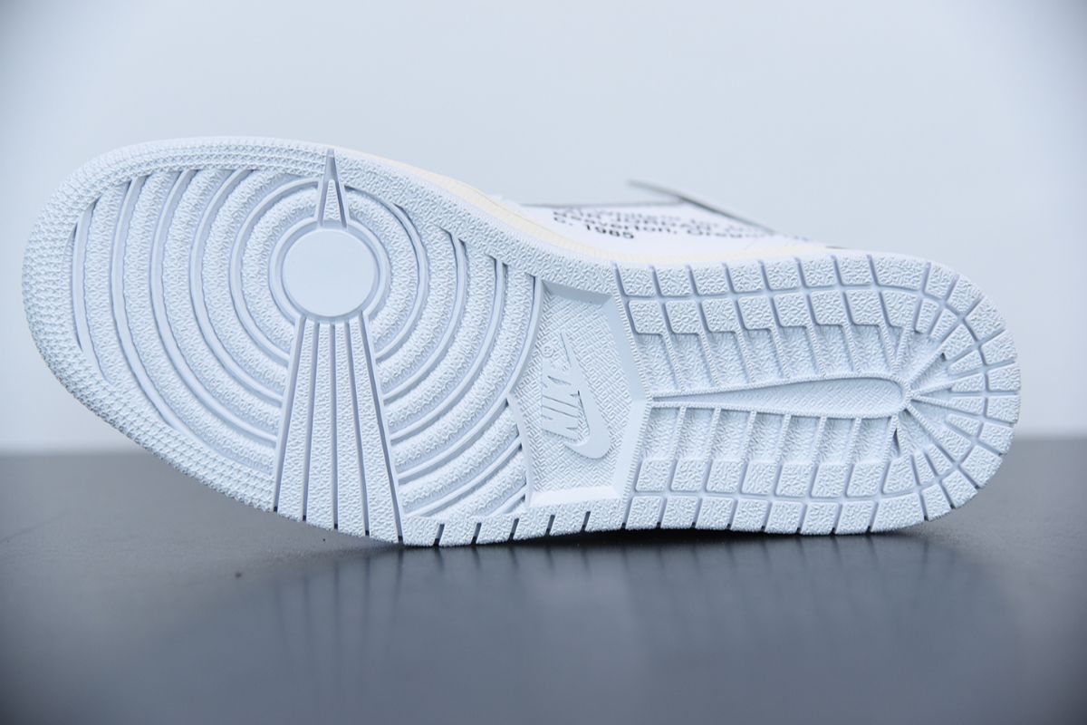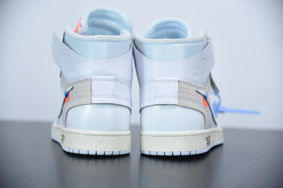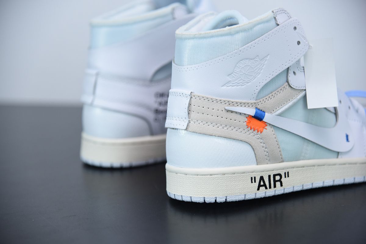 Dieses Modell des Air Jordan 1 ist in einer weiß-auf-weiß Farbgebung erhältlich. Das Obermaterial des Sneakers besteht aus weißem Leder und Mesh mit Swoosh-Branding auf beiden Seiten und blauen Akzenten. Der Schuh hat außerdem Wings-Logos an den Knöcheln. Er verfügt über orangefarbene Laschen, einen schwarzen „AIR”-Schriftzug auf der Zwischensohle und einen schwarzen „Off-White™ for NIKE”-Schriftzug an den Seiten.