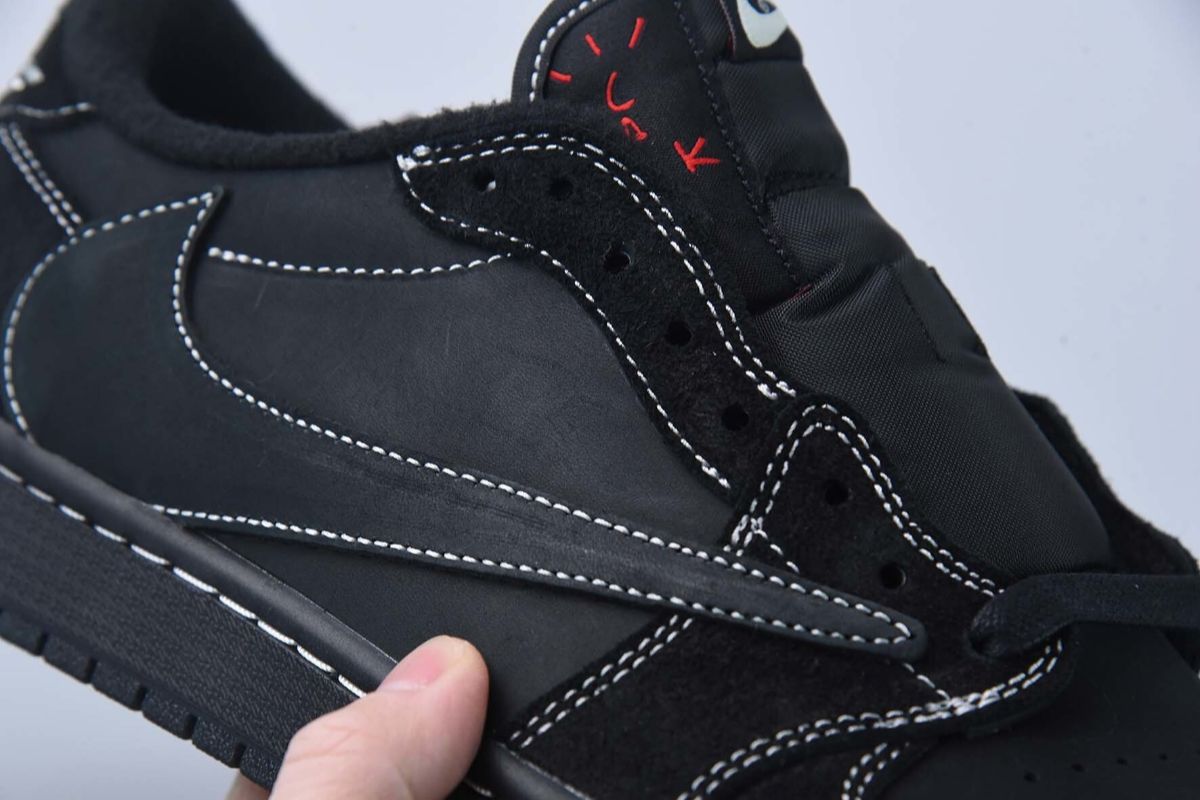 Das Modell kehrte mit seinem charakteristischen, nach hinten gerichteten Nike Swoosh zurück, jedoch mit einem neuen Kontrast-Stichdesign. Die komplett schwarzen Nubuk-Sneaker verfügen über ein Nike Air-Logo auf der Zunge und ein Air Jordan Wings-Logo auf der rechten Fersenlasche. Im Lieferumfang sind rote, schwarze und weiß-schwarze Schnürsenkel enthalten, und auf der Fersenlasche des linken Sneakers befindet sich eine gestickte Biene, die von Travis‘ Tochter Stormi inspiriert ist.